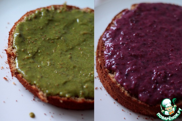 Вниз нанесем фисташковый крем, затем положим 2-й корж и нанесем на него ежевичный крем.