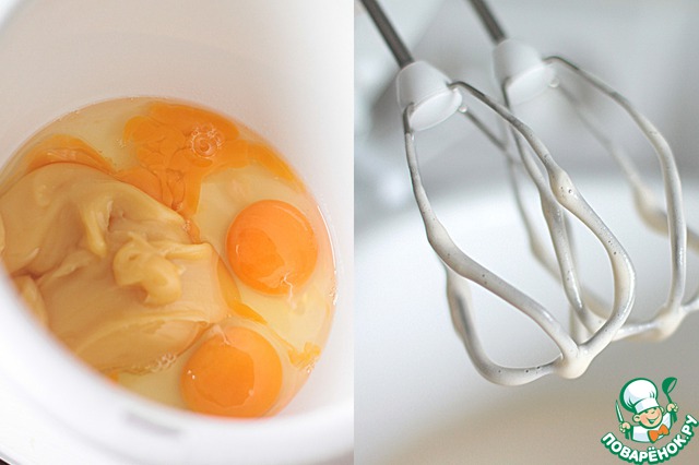 Для приготовления бисквита нам нужно взбить яйца с медом и 2 столовыми ложками горячей воды до белого цвета. Я всегда ставлю таймер на 10 минут и оставляю массу взбиваться.