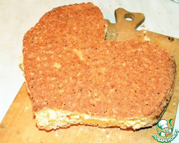 Остывший бисквит вырезаем в форме сердца (у меня нет формы в виде сердца - выхожу из положения таким образом!) Затем разрезаем бисквит на два коржа.