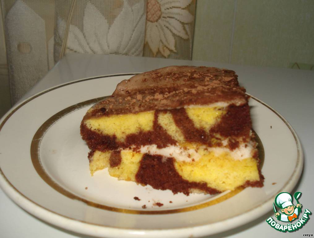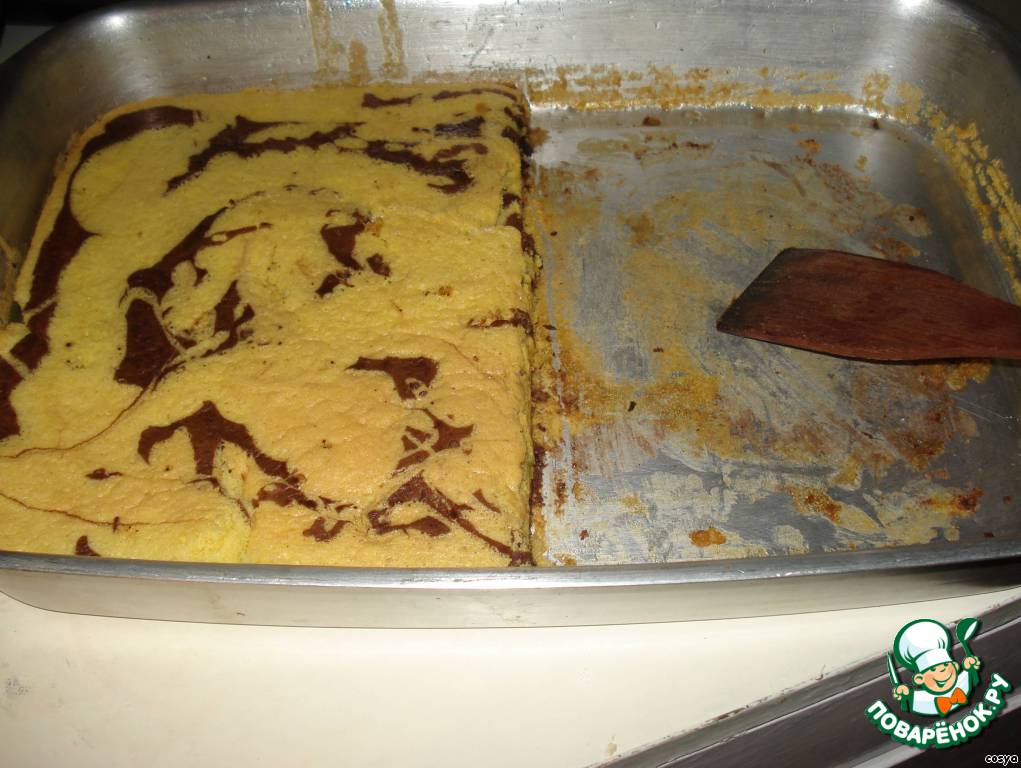 Смазываем форму маслом (я брала прямоугольную с высокими бортиками). Выливаем тесто в форму попеременно - то белую, то шоколадную массу, чтобы получилось "тесто-зебра".