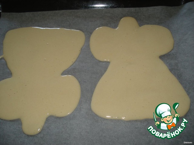Итак, займемся. Миксером взбить яйца с сахаром и ванильным сахаром до пены, ввести просеянную с разрыхлителем муку и аккуратно размешать ложкой тесто. Коржи можно делать разной формы, в данном случае - в форме школьного звонка. Для этого нарисовать звонок с бантиком на листике белой бумаги и перебить его на бумагу для выпечки. Слегка смазать ее маслом и распределить тесто, стараясь не выступать за контуры рисунка. Но, если уж случилась какая-то погрешность, то потом можно будет подровнять испеченные коржи.