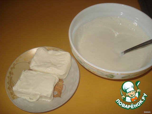 Я заметила, что магазинная сметана, после взбивания ее миксером, становиться очень жидкая, потому я просто перемешиваю сметану с сахаром и отставляю на минут 5, пока сахар не растворится, еще раз перемешиваю ложкой и крем получается довольно густой. Для пущей полезности и вкусности крема додаю туда детскую творожную массу и все тщательно размешиваю.