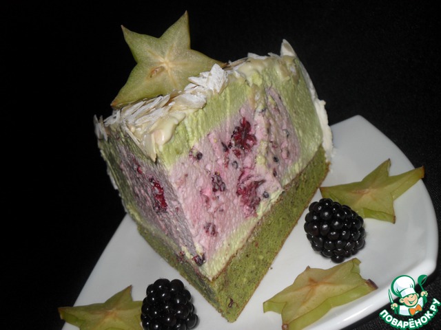 Приступим к сборке: на дно формы диаметром 26 см положить бисквит, затем часть фисташкового мусса, застывший диск ежевичного мусса, остаток фисташкового мусса.