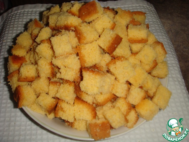 Кубики бисквита смешать с кремом и выложить в форму. Сверху положить круглый корж кремом вниз. Поставить в холодильник, лучше на ночь. Затем перевернуть торт на плоское блюдо.