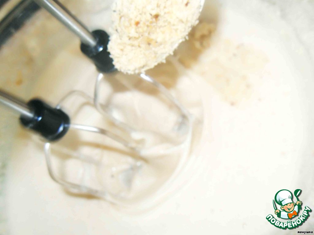 Добавить к яйцам, снизить скорость миксера на минимальную и, не прекращая взбивать, добавить шоколад и ореховую крошку.