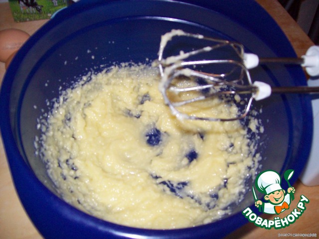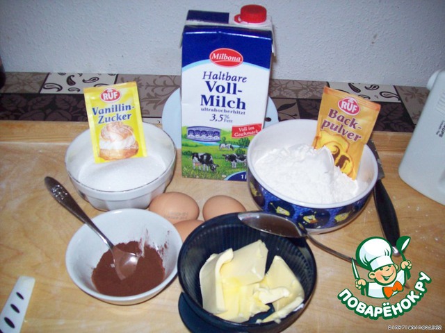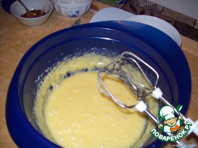 По одному вбить яйца - взбить, добавить молоко и хорошо вымешать. Затем добавить смешанную с разрыхлителем и просеянную муку, хорошо вымесить тесто. Разделить тесто на две части-в одну из частей добавить какао и хорошо вымесить миксером - до однородного теста.