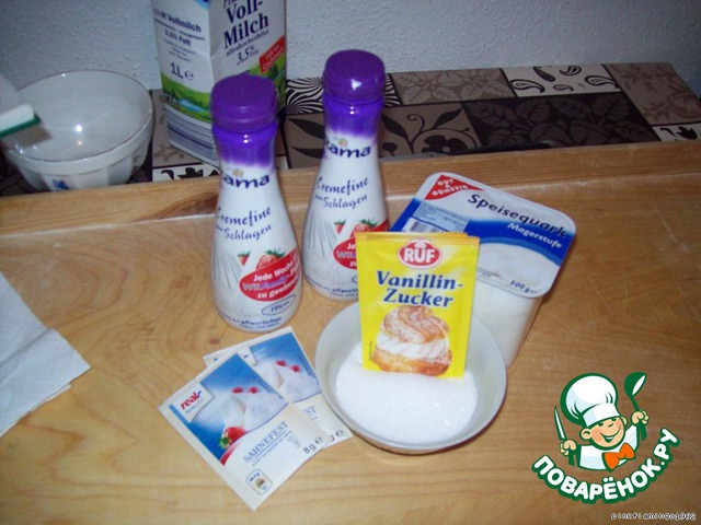 Это то, что нам понадобится для крема. Я беру последнее время не сливки, а Крем Файн. Не знаю есть ли такое в России и как называется - это растительные сливки с наименьшей жирностью. Использую точно так же как и сливки.
