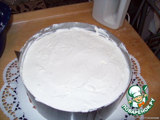 Не снимая наш обруч с торта ставим торт на тортницу и наносим крем на остывший торт.