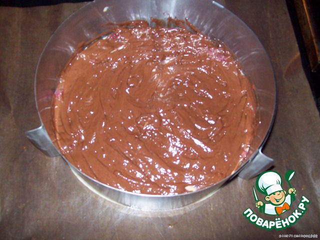 Дно формы выстелить бумагой выпечки или смазать маргарином и выложить светлое тесто в форму. На тесто выложить вишню, которую мы заранее откинули на дуршлаг, что бы стёк сок, но сок не выливаем, он нам ещё пригодится.Вишню не много вдавить в тесто, сверху на вишню выложить тесто с какао, разровнять и поставить в нагретую до 175С духовку на 50 мин. Но надо смотреть ещё на то, какая духовка, у меня испёкся за 40 мин. Готовность проверяем как всегда - деревянной палочкой, если сухая - значит торт готов.
