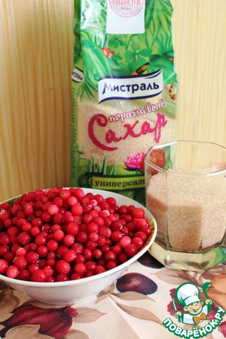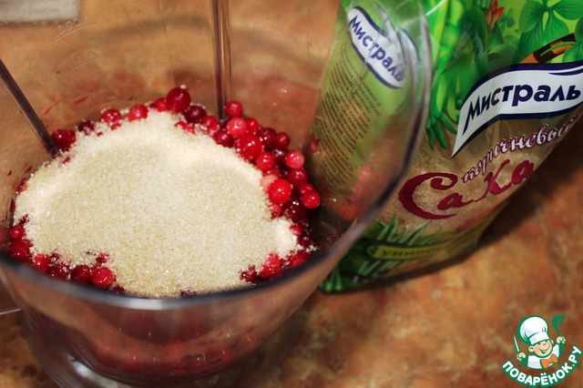 В чашу блендера кладем бруснику, клюкву и сахар. Перемалываем до однородной массы.