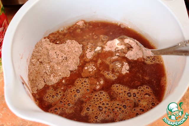 Смешать муку, сахар, растительное масло, какао-порошок, разрыхлитель. Влить яблочный сок.
