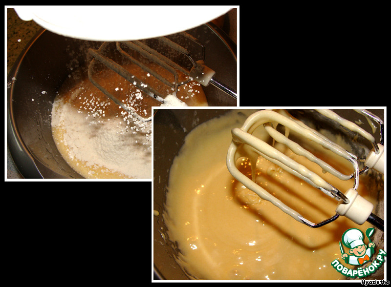 Просеять в чашку с яично-масляной смесью муку, добавить соду и разрыхлитель - все взбить.
