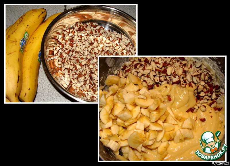 Добавляем в тесто орехи и нарезанные кусочками бананы, перемешиваем.
