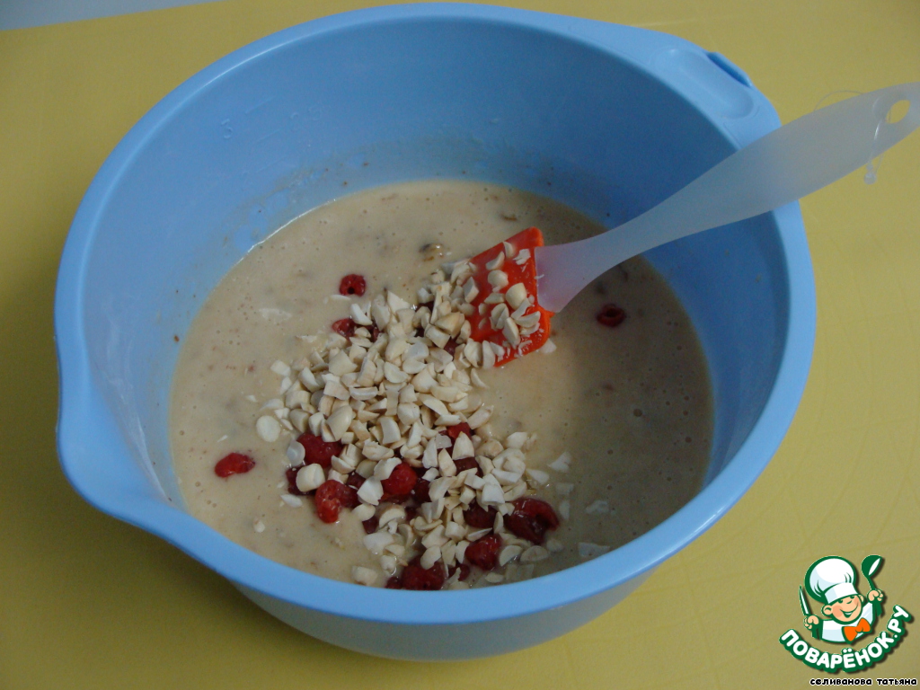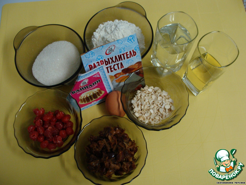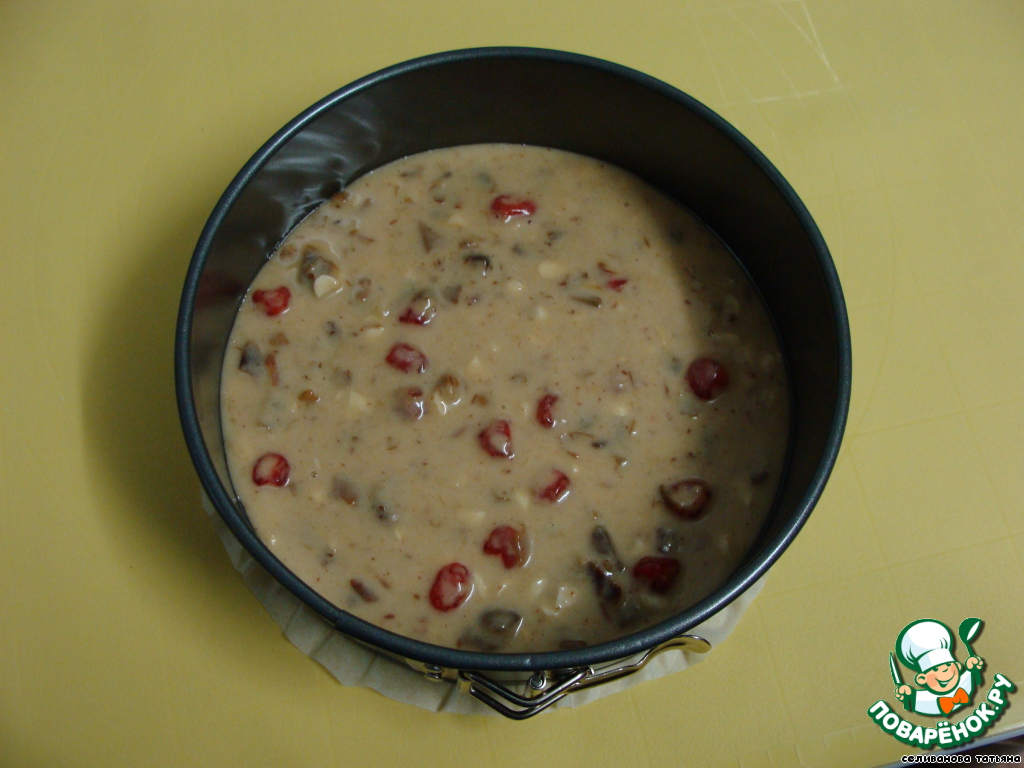 Всыпать в тесто вишню, дробленые орехи и финики. Перемешать.