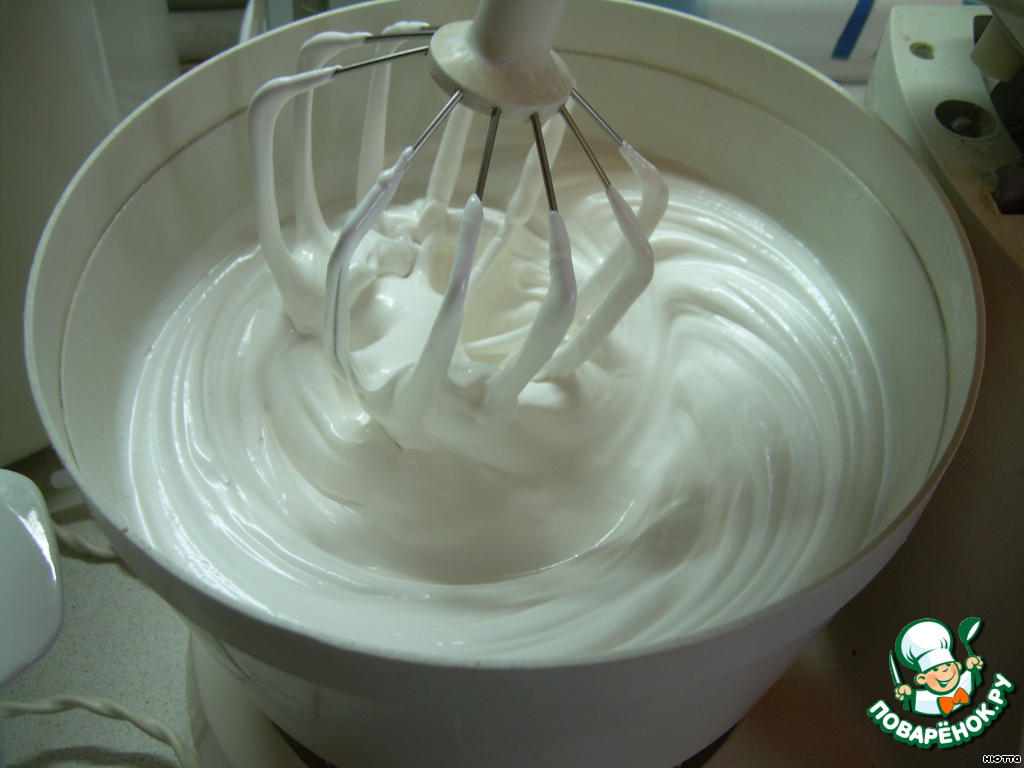 Как только сироп начнёт увариваться, взбиваем белки (если есть комбайн, то можно и одной управиться, а если миксер - придётся позвать помощника, так как сироп надо всё время помешивать - агар-агар так и норовит прилипнуть и белки надо взбить до состояния "жёстких пиков"! А теперь, когда белки взбились и сироп уварился до нужного состояния, вливаем кипящий сироп в белки, получается итальянская меренга...