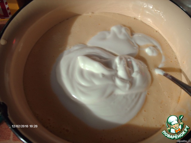 Теперь отдельно взбить белки с 0,5 стакана сахара до крепких пиков. Половину порции взбитых белков ввести в массу с желтками, добавить муку и аккуратно все перемешать, чтобы мука разошлась полностью и не было комочков. Дальше ввести оставшиеся белки и еще раз все аккуратно перемешать, чтобы белки не осели.