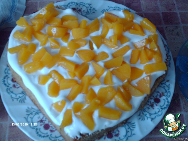 Корж разрезаем на три части (в этот раз я делала торт в виде сердца), и прослаиваем кремом, по верх крема положить кусочки персиков.