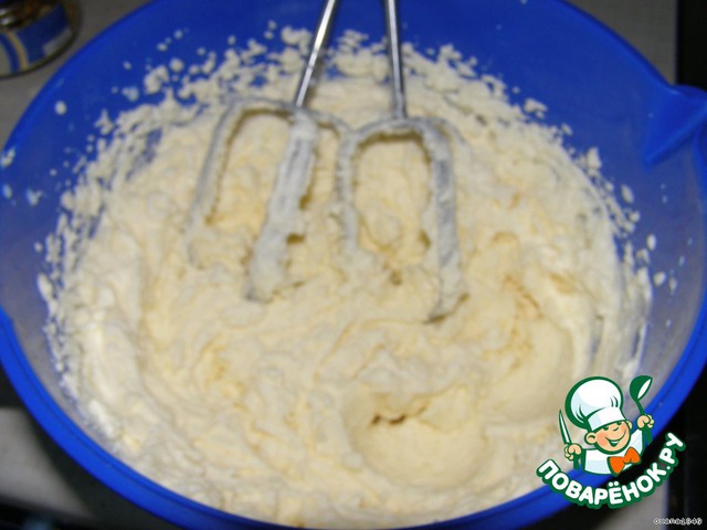 Сметану взбиваем с сахарной пудрой. Честно говоря, я не знаю, сколько у меня ушло пудры. Написала приблизительно. Пробуйте сами, кому какой вкус нравится: сладко или очень сладко.