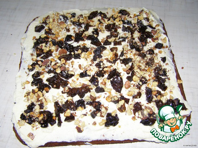 Сверху - второй корж, тоже пропитать, и с орехами и черносливом,