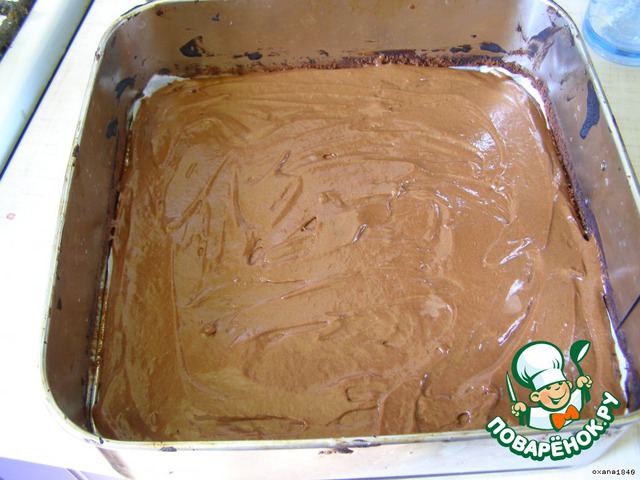 На один корж смешиваем 1 стакан сметаны, 1 яйцо, 1 стакан сахара, 1 ч. л. соды, 1 ст. л. какао и 1 стакан муки. Тесто жидковатое.