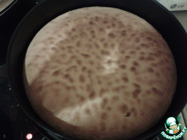 Готовое тесто выливаем в смазанную маслом форму и выпекаем в духовке до готовности. Достаем готовый корж и оставляем охладиться.