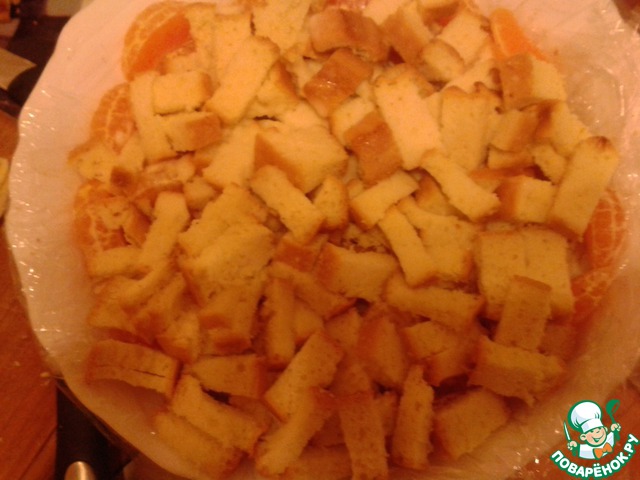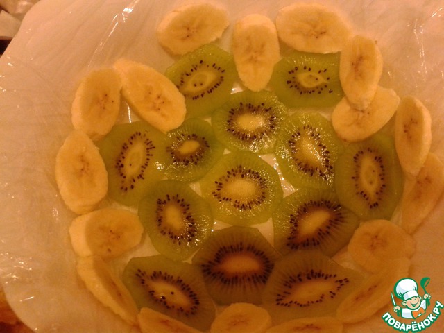 Дальше готовим и оформляем торт. Для этого глубокую форму выстилаем целлофаном так, чтобы снаружи остались достаточные по длине хвостики (для того, чтобы укрыть ими торт сверху), выкладываем нарезанные кусочками фрукты (у меня были киви, бананы, мандарины и спелая мягкая груша), заливаем частью крема.