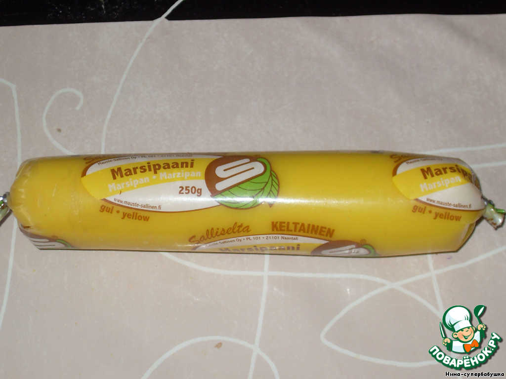 А марципан я использовала вот такой, уже готовый. Мне привезли из Финляндии пяти разных цветов. Упаковка - 250г. Очень удобно.