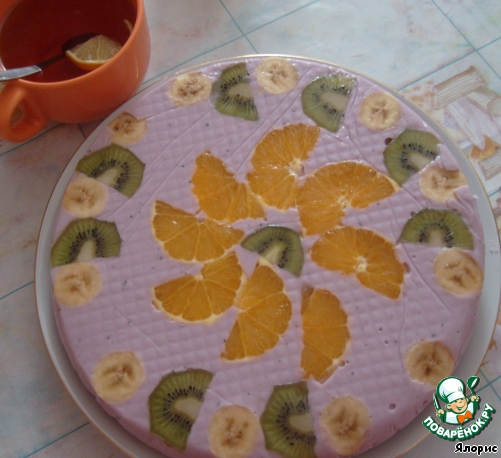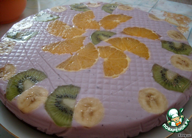 Дно разъемной формы, в которой пекли бисквит, покрываем пищевой пленкой. На нее выкладываем нарезанные по желанию фрукты: апельсин, киви, банан. Осторожно заливаем фрукты загустевшим желе. Ставим торт в холодильник, накрываем бисквитом и отправляем торт снова в холод до прихода гостей (минут на тридцать). Перед самой подачей аккуратно переворачиваем торт на блюдо, снимаем осторожно пленку и, вуаля!!!!