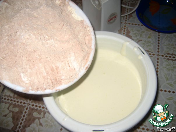 Всыпаем всю муку и быстро перемешиваем. Для того, чтобы всё хорошенько размешать у нас есть ТОЛЬКО 30 СЕКУНД!!!!!!!!