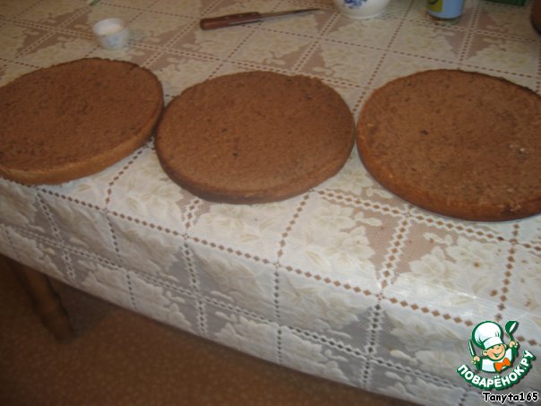 Теперь разрезаем бисквит на три коржа и каждый пропитываем сиропом.