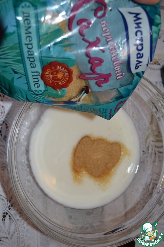 Пока выпекается корж, в йогурт добавляем ванилин и сахар Демерара fine от ТМ "Мистраль". Йогурт по густоте должен быть похож на сметану. У меня был немного жидковатый и он, не слишком закрепил потом кусочки коржа. Если у Вас йогурт очень густой, можете его разбавить молоком.