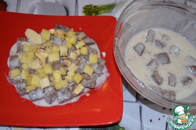 Выливаем в любую удобную для Вас форму (я на всякий случай, еще и смазала ее растительным маслом)и ставим в микроволновку на максимальную мощность. Выпекаем там корж 4 минуты. Остужаем слегка и нарезаем на мелкие кусочки.