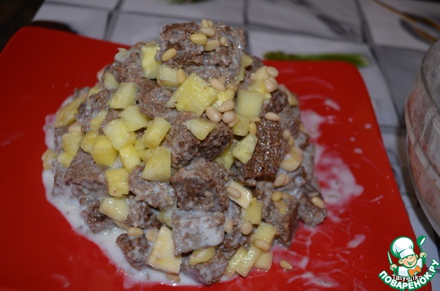 Фрукты нарезаем мелкими кусочками. В крем обмакиваем кусочки коржа и выкладываем на блюдо. Сверху посыпаем фруктами, орешками на Ваш вкус.