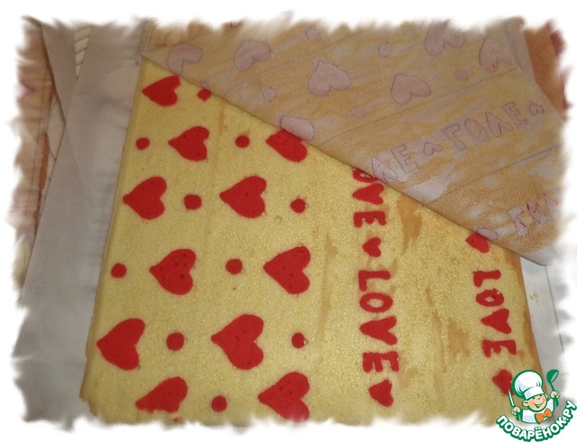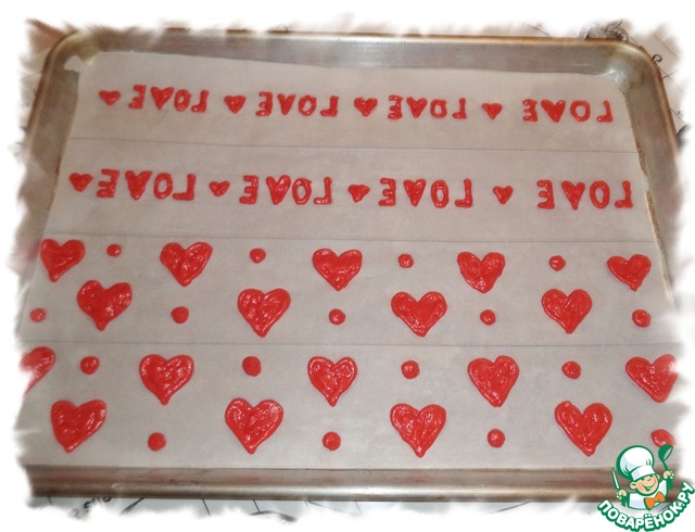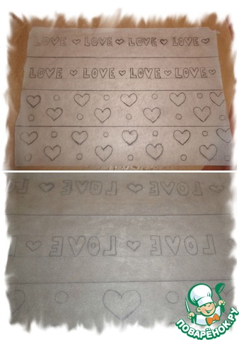 Подготавливем бумагу для выпечки по размеру противеня. В зависимости от ширины, делим бумагу на полоски. Ширина полоски - это высота вашего торта, поэтому чем уже полоска, тем торт будет ниже и соответственно чем шире полоска, тем торт будет выше. У меня полоски шириной 7,3 см. В центре каждой полоски простым карандашом пишем слова и рисуем сердечки (или пишем и рисуем что хотим). Переворачиваем бумагу рисунком вниз и укладываем на противень.