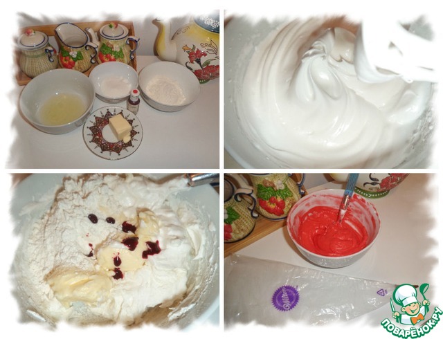 Теперь очередь пасты, которой будем рисовать. Взбить один белок с сахаром, добавить мягкое сливочное масло и муку. Всё хорошо перемешать до однородной массы. Добавить краситель и ещё раз хорошо перемешать.
