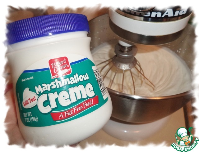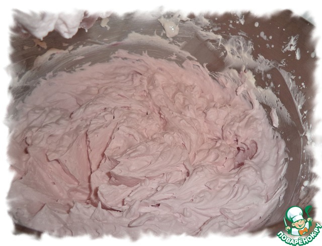 Пока корж остывает, делаем крем. Вишню предварительно разморозить. Сливки взбиваем до плотного состояни, продолжая взбивать добавляем крем из маршмеллоу и 3 ст. л. сока от вишни для цвета.
