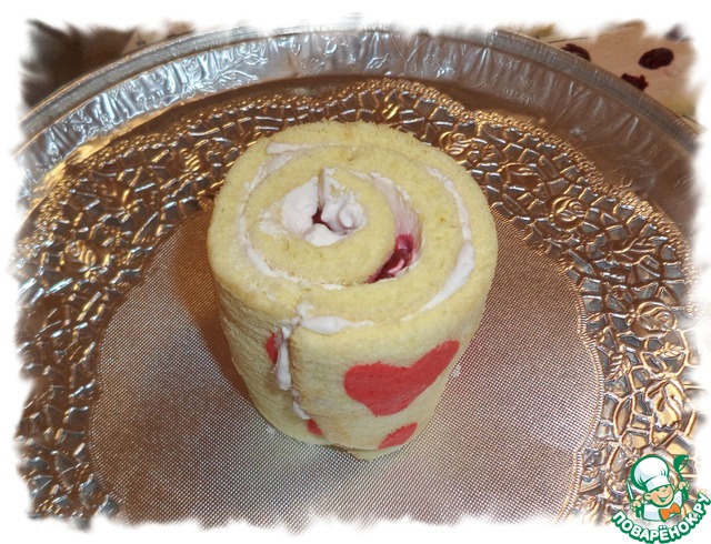 Kаждую полоску переворачиваем на слегка смоченое водой полотенце рисунком вниз, укладывая полосочки плотно друг к другу. Сворачиваем полотенце вместе с бисквитом и оставляем так до полного остывания.