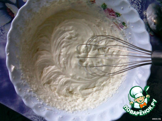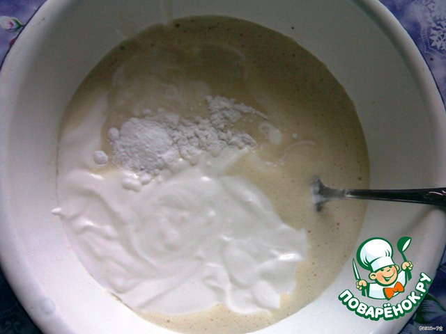 Добавляю сметанку (у меня была жирность 15%, но в данном случае это неважно), сгущенку, разрыхлитель