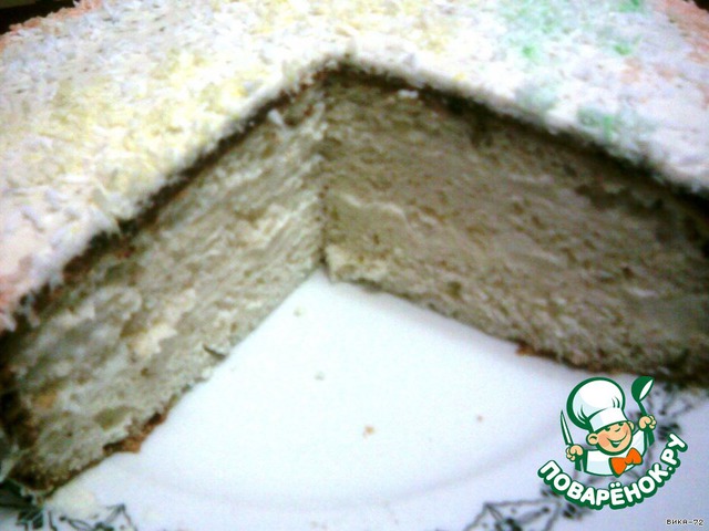 Верх и бока торта я обмазала кремом и украсила разноцветной кокосовой стружкой, пытаясь изобразить мимозу