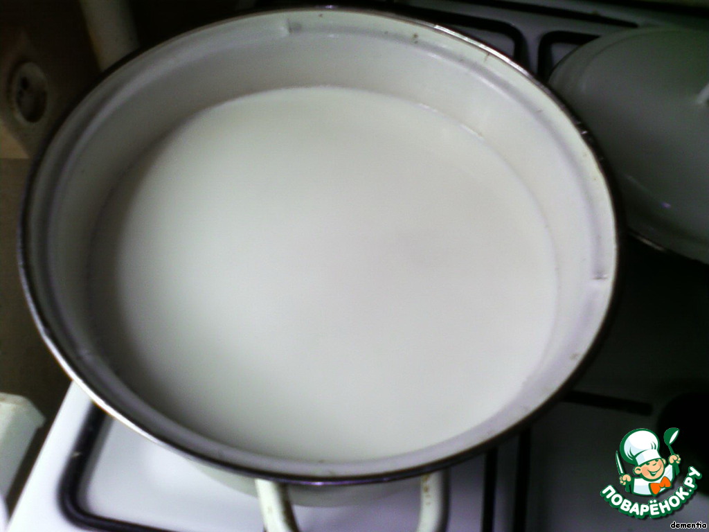 Молоко + смесь варим, мешая, минут 6-7, должно загустеть.