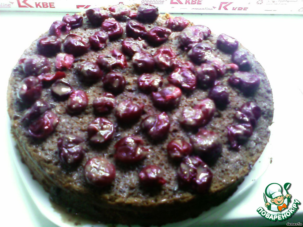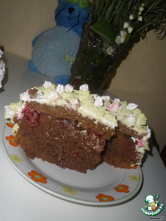 Коржи смазываем кремом и прослаиваем вишенкой.
