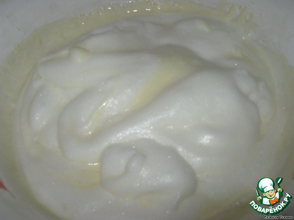 Белки взбить в крепкую пену, постепенно добавляя 2-3 ст ложки сахара.