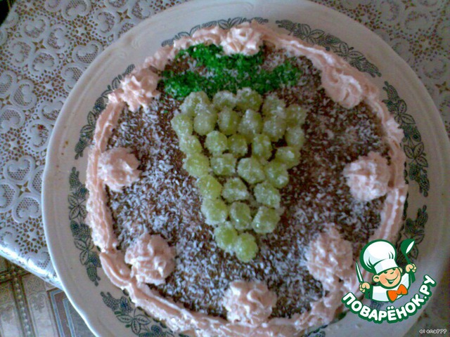 Обсыпаем тёртым шоколадом, украшаем: заранее горсточку винограда кладем в оставшийся сахарный сироп на 20 минут, затем сцеживаем, каждую виноградинку обваливаем в сахаре и выкладываем на торт в виде гроздочки винограда.