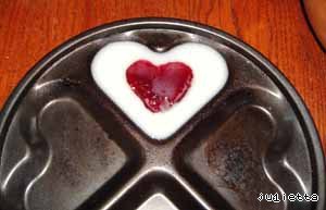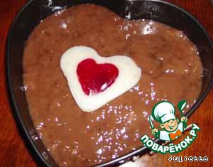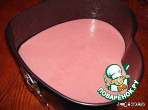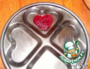 Выложить бОльшую часть желе в форму с тестом, сверху уложить маленькое желейное-сердечко,