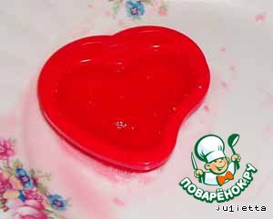 Полностью схватившееся желе извлечь из формочки (я помогала себе ножом), уложить по центру формочки-сердечка большего размера.
