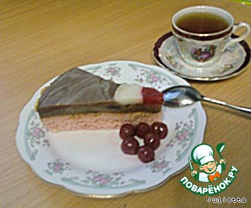 Торт был приготовлен вчера в подарок племяннице-имениннице и ушел в целом виде, поэтому сразу сделать фото в разрезе не получилось. А сегодня была у именинницы в гостях, пила чай с тортом, но сфоткать получилось только на телефон (фотоаппарат с собой не брала). Так что, за качество фото не обессудьте...