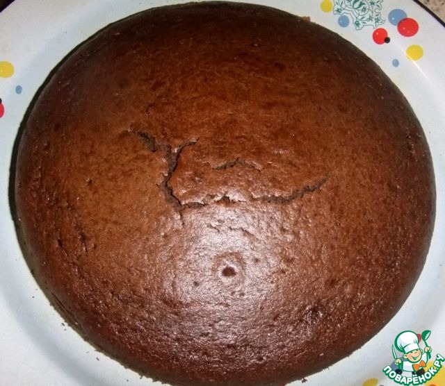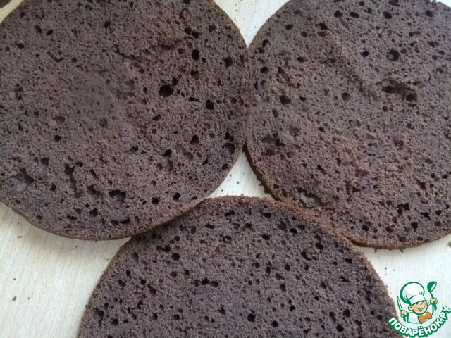 Приготовить бисквит. Яйца взбить с 1/2 стакана сахара. Масло взбить с 1/2 стакана сахара. Соединить обе массы, добавить сметану. Всыпать муку, смешанную с какао и содой. Замесить тесто, вылить в форму, застеленную пергаментом. Выпекать при 180 гр около получаса, время зависит от духовки.