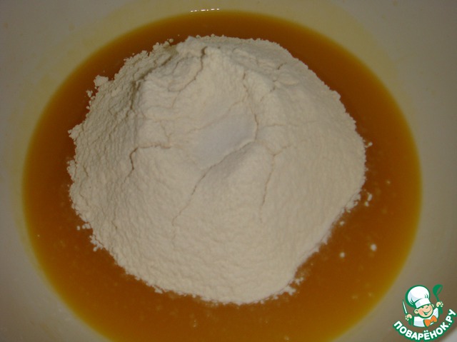 Вылить тесто в форму, диаметром 26 см, смазанную растительным маслом и обсыпанную мукой.