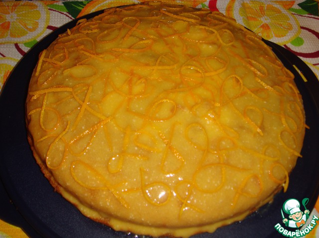 Промазать торт кремом внутри и сверху и украсить натертой апельсиновой цедрой.