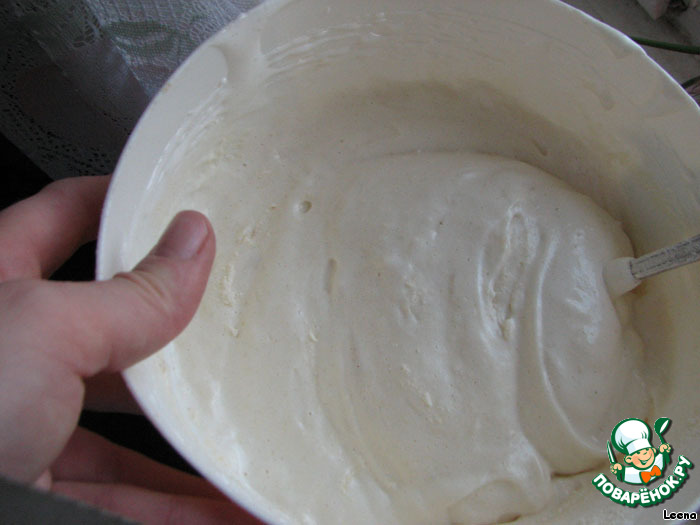Далее готовим два типа крема: белый и коричневый. Белый - это взбитые с сахаром жирные сливки до устойчивых пиков.